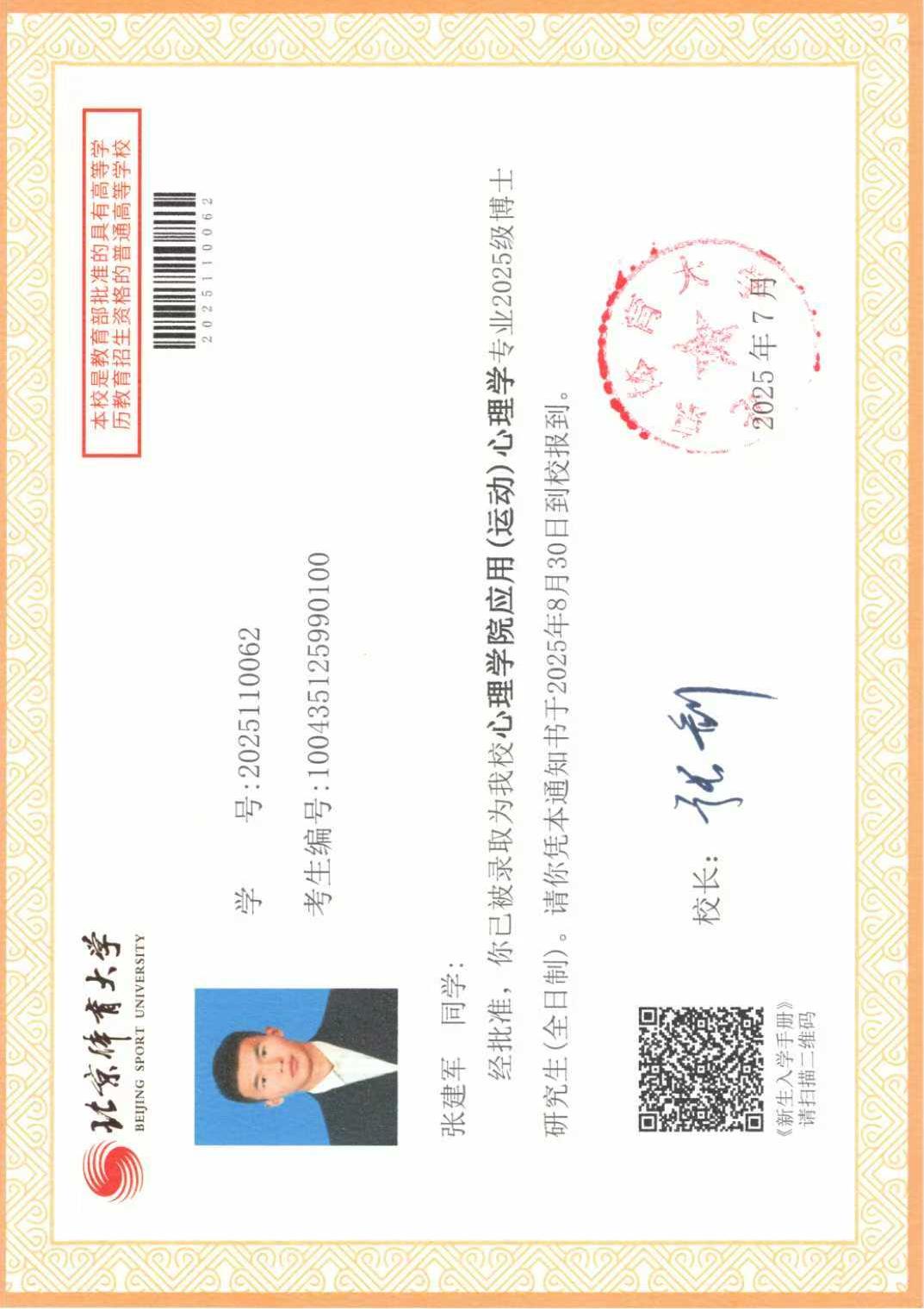 我们2018级学子张建军成功考取北京体育大学应用(运动)...