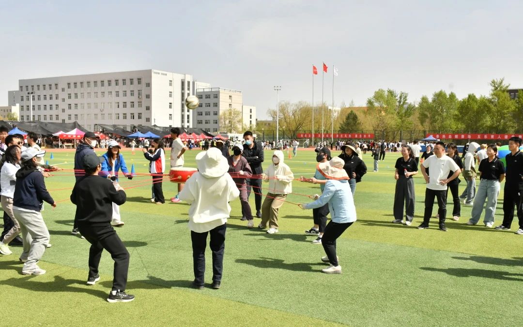 同心击鼓”作为经典团队项目,考验着教职工的默契与协作能力。每队10名队员手持绳索拉紧鼓面,通过精准控制鼓的高度与角度,使球在鼓面上连续弹起。比赛中,老师们屏息凝神,根据球的落点迅速调整绳索松紧,时而俯身、时而跃起,鼓面与球的每一次碰撞都牵动着现场观众的心弦。